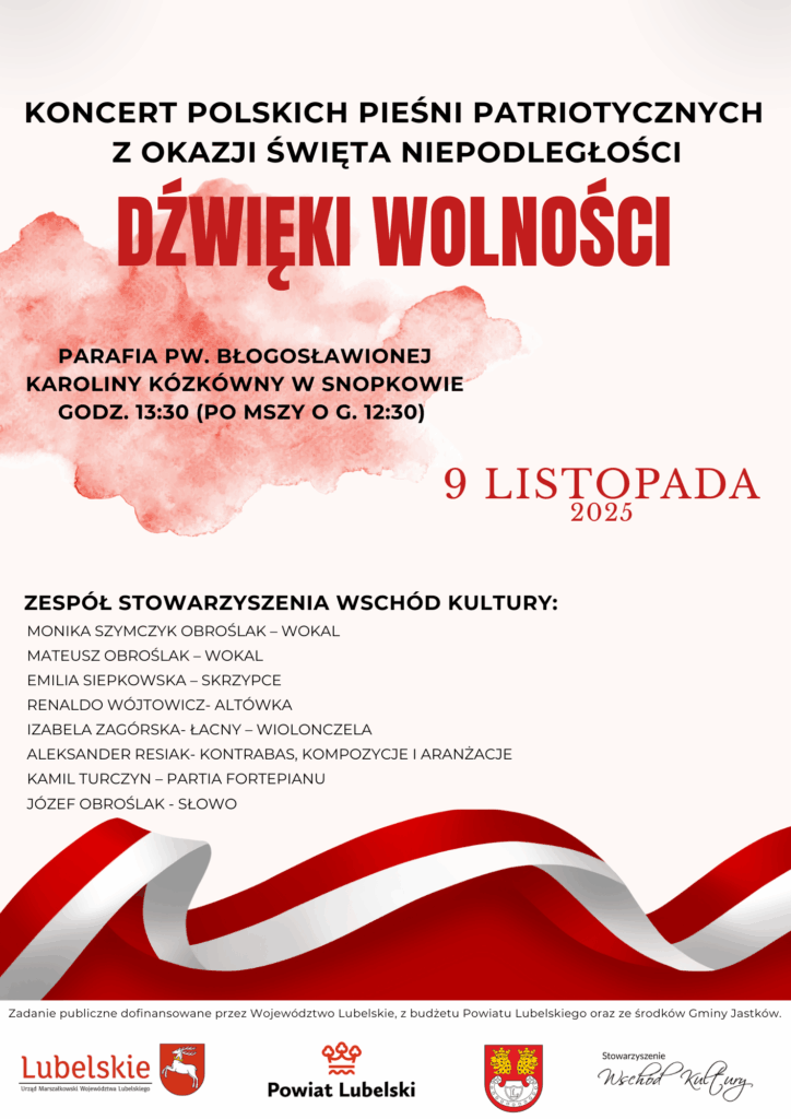 Wraz z nadejściem listopada rozpoczniemy cykl 3 koncertów patriotycznych pt.”Dźwięki wolności”. W programie znajdą się najsłynnijesze pieśni narodu polskiego w autorskich opracowaniach Aleksandra Resiaka. Jako solistów usłyszymy Monikę Szymczyk-Obroślak i Mateusza Obroślaka, a towarzyszyć im będzie zespół kameralny Stowarzyszenia Wschód Kultury.