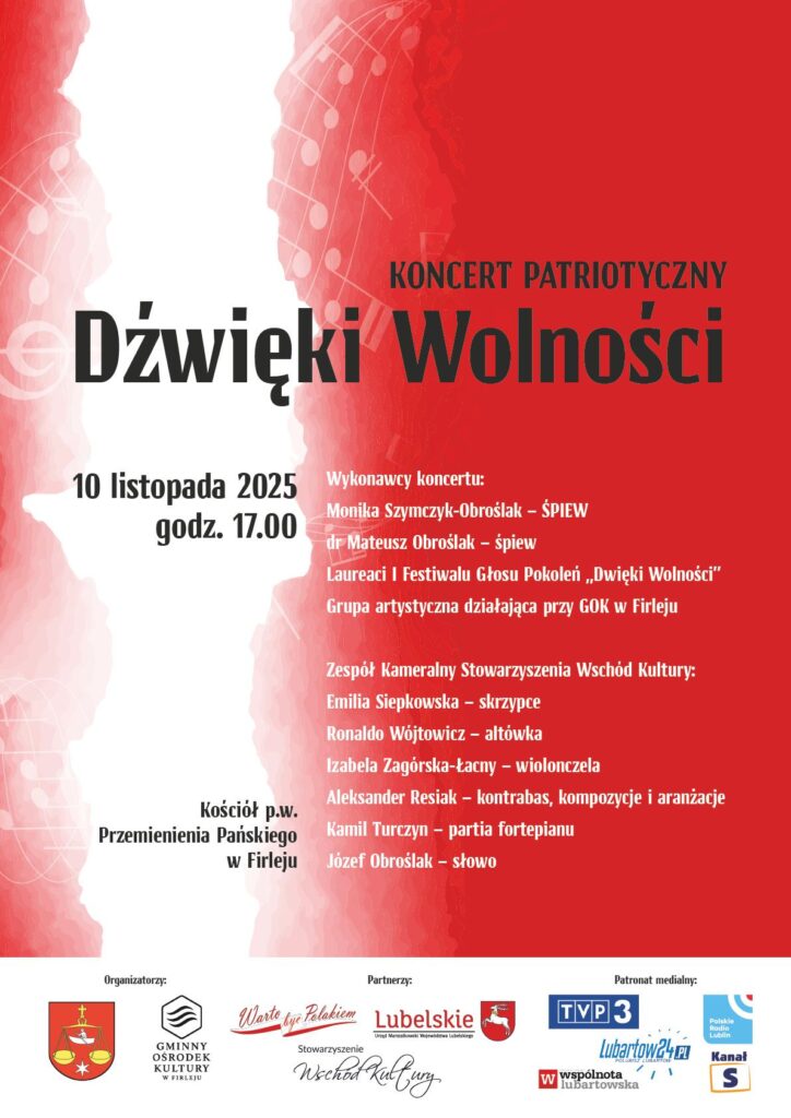 W poniedziałek 10 listopada zapraszamy na uroczysty koncert pieśni patriotycznych do Firleja. Koncert rozpocznie się o godz. 17:00w Kościele pw Przemienienia Pańskiego w Firleju. Artystom Stowarzyszenia Wschód Kultury towarzyszyć będzie Grupa Artystyczna działająca przy Gminnym Ośrodku Kultury w Firleju.