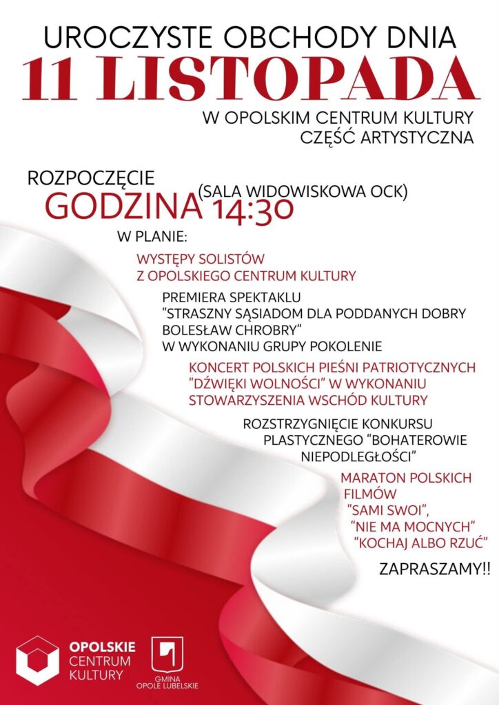 We wtorek 11 listopada zapraszamy do Opolskiego Centrum Kultury w Opolu Lubelskim, gdzie o godz. 15:00 rozpocznie się koncert pieśni patriotycznych w wykonaniu artystów Stowarzyszenia Wschód Kultury.